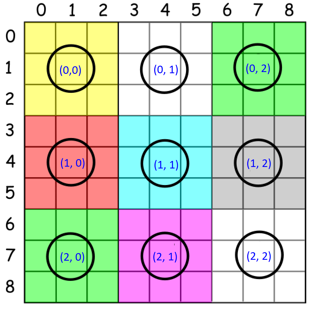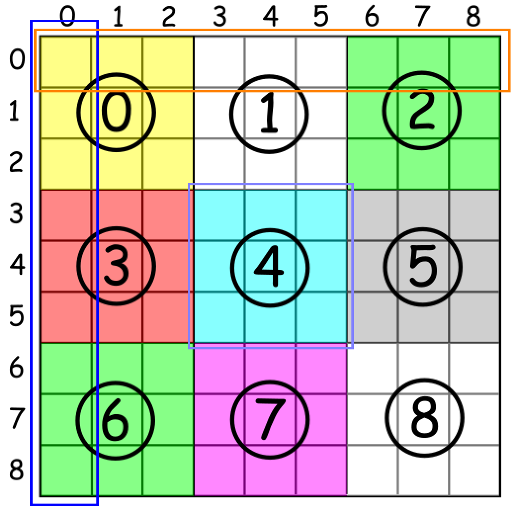int boxPos = (i / 3) * 3 + j / 3; //将大数独棋盘分成9个小棋盘,编号0~8